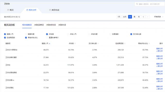 市场分析直接进入去看关键词,通过对搜**气高、在线商品数少、商场占比低,点击率与支付转化率高的关键词进行标记