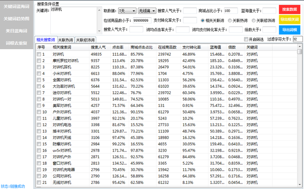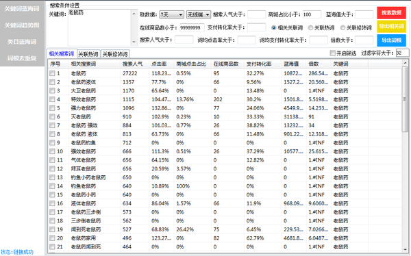 这个软件是生意参谋或者类似软件调取的淘宝官方数据,以对讲机和老鼠药这两个产品为例,我们来对比一下他们的竞争度。对讲机这个关键词七天的搜索人气是49835,在线商品数是239742,老鼠药这个关键词七天的搜索人气是27222,在线商品数是95.用一个最简单的比例对比,49835/239742=0.207,27222/95=286.547,我们可以非常明显的感受到老鼠药这个产品要比对讲机好做一千多倍。