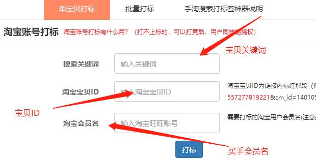 首先你要准备买手的旺旺号,和需要SD宝贝的关键词和宝贝ID,输入之后,打标成功,那么买手就被打上了宝贝标签,从而形成强烈的购物需求,也达到了精准店铺人群的一个效果。