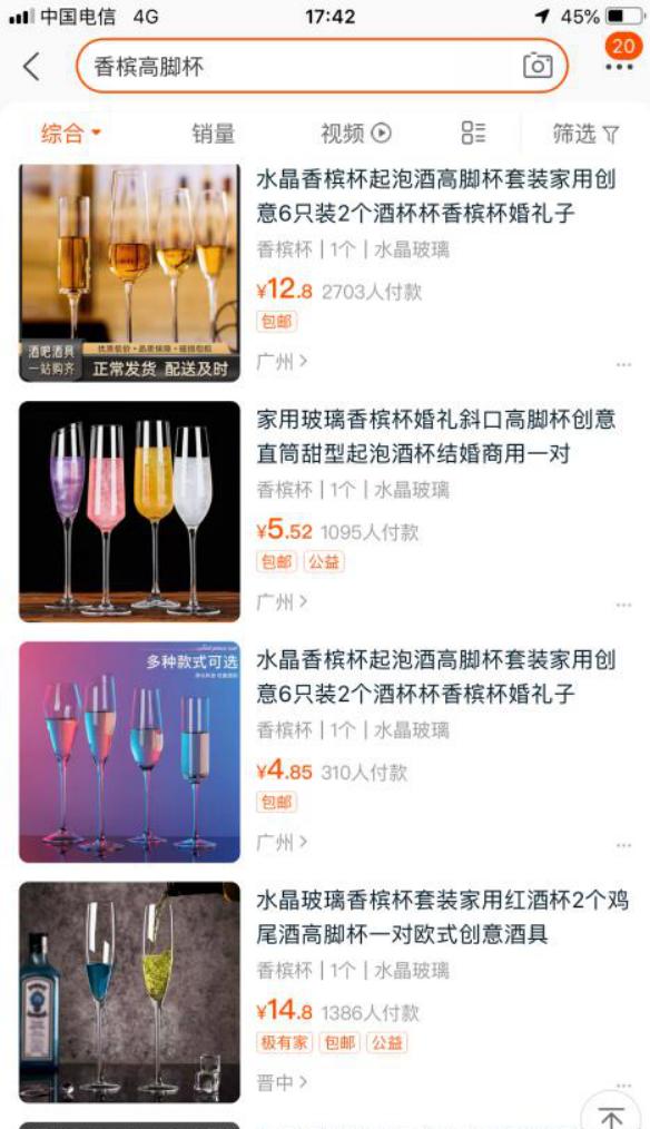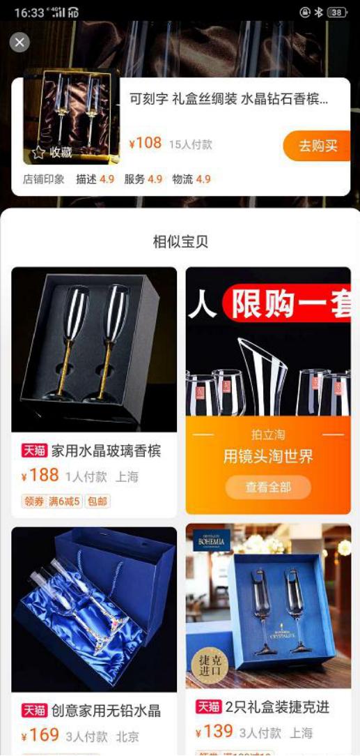 例如:这里我选择一个偏冷门的香槟高脚杯看看它的相似宝贝,这里我选择的是100元以上,出来的相似款宝贝属性也相差无几,而大部分的高脚杯价格其实是50元以下。