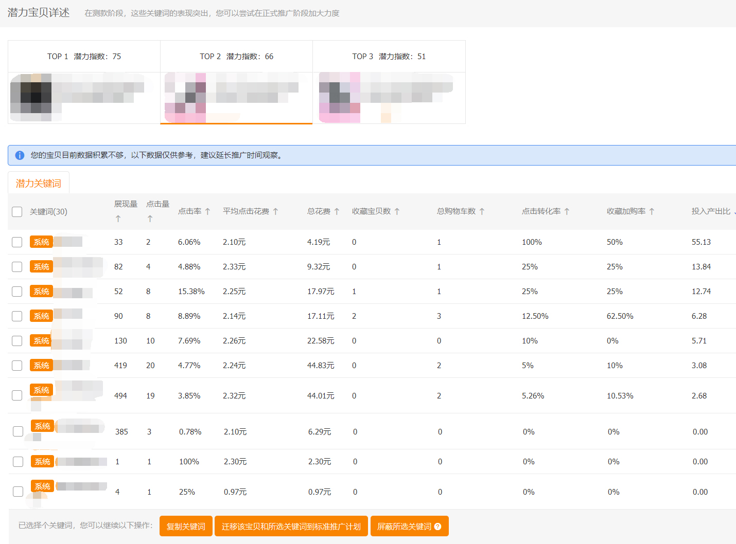 问题:趋势明星计划,后期怎么做优化呢? 解答:在报表—智能推广报告里面可以查看到对应计划系统智能匹配的关键词,可以选择对应时间段内的数据,根据投产,收藏加购数据做判断,如果在产品的转化周期内,对应的数据转化跟不上,可以定期把转化数据不好的关键词进行屏蔽,让花费更加效益化。 注意点:关键词屏蔽时注意做好对应的记录,一定时间段对应的关键词的数据可能会表现不好,后期在做标准计划关键词选择时注意做好筛选。  问题:为什么计划的PPC会比设置的出价会高呢? 解答:趋势明星计划设置的是基准出价,系统会根据基准出价进行智能调整,帮助商家获得合理的优质流量,智能调整范围为-30%~30%,趋势明星计划最高溢价为30%,比如你设置的出价是1元,对应的最高扣费可能是1*(1+30%)=1.3元。 注意点:为了避免智能计划跟标准计划流量冲突,建议趋势明星计划的扣费不要高于标准出价。