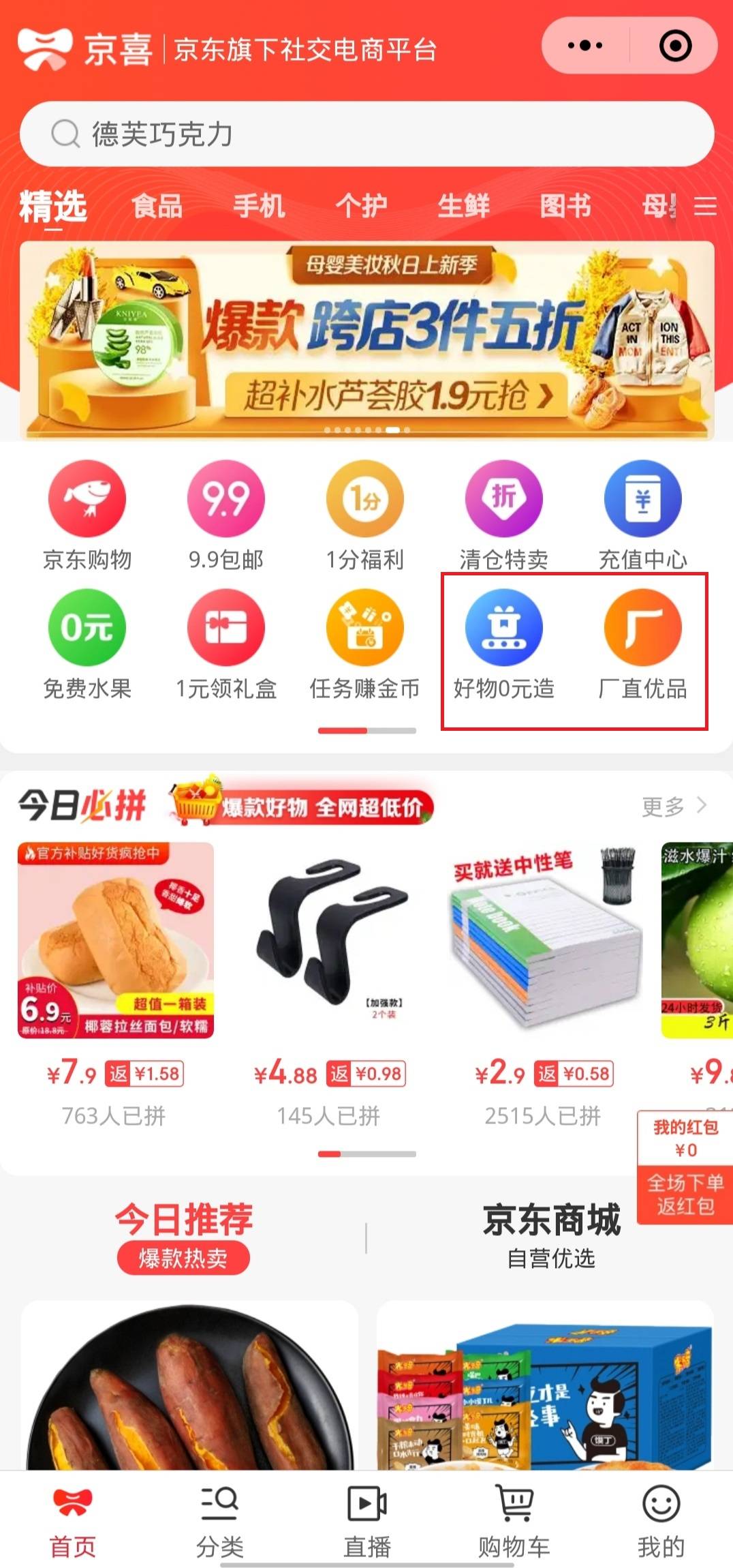 从产品来看,京喜要优于拼多多。打开京喜我们可以看到“9.9包邮”、“好物”、“厂直优品”等,说明京东在为用户提供拼购低价同时,仍然追求产品的质量,这也和京东原有的高端定位有关。